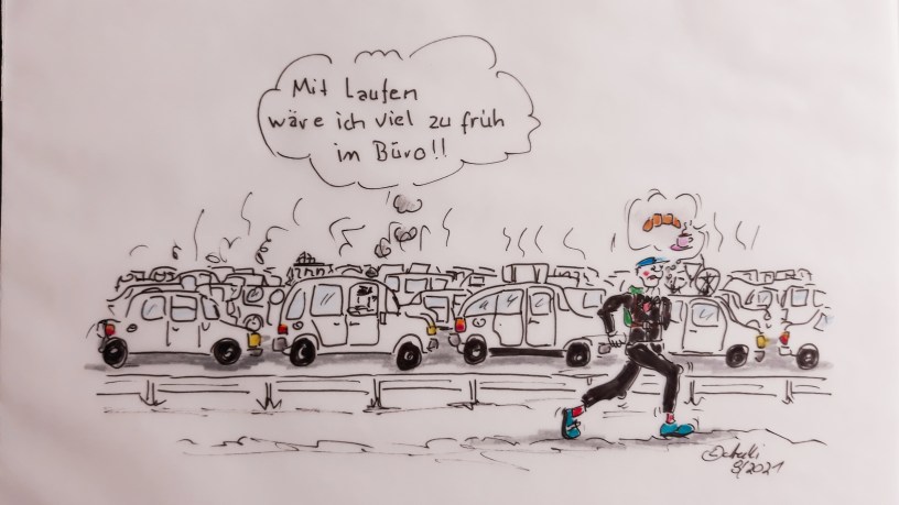 Cuxhaven-Cartoon: Das ist die Frage aller Fragen, morgens um 7:00 Uhr, auf dem Weg zur Arbeit: „Sollte ich mal Laufen? Lieber nicht, denn dann wäre ich viel zu früh im Büro.“