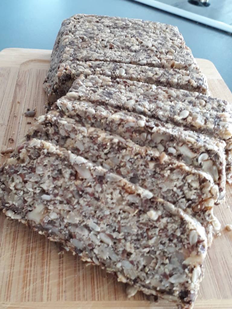 Denn das „lebensverändernde“ Brot ist ganz ohne Mehl und Hefe gebacken. Es ist durch die Nüsse und verschiedene Samen sehr reich an Proteinen, und enthält Superfoods (Leinsamen, Chia-Samen, Flohsamenschalen).