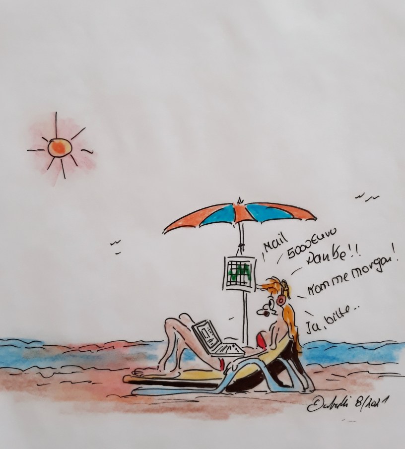 Der Laptop ist auch am Strand aufgeklappt, das Handy quasi mit dem Ohr verwachsen, ins Büro eine Standleitung eingerichtet. „Ich will nur mal meine Mails checken”, „Nur mal kurz nachfragen, ob es mit dem Auftrag geklappt hat”, das hören die geplagten Mit-Strandurlauber von dieser Urlaubsspezies/Strandtypen, die man mit dem Wort Urlaub wahrlich kaum in Verbindung bringen kann.