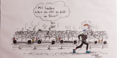 Cuxhaven-Cartoon: Das ist die Frage aller Fragen, morgens um 7:00 Uhr, auf dem Weg zur Arbeit: „Sollte ich mal Laufen? Lieber nicht, denn dann wäre ich viel zu früh im Büro.“