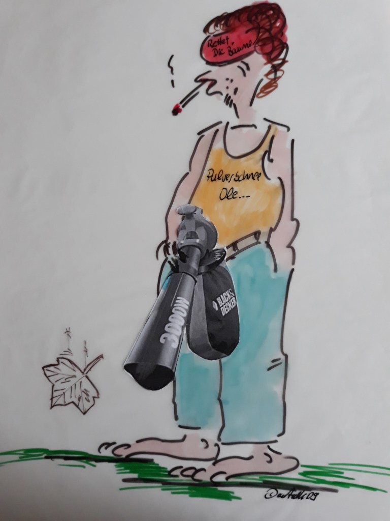 Keine Angst, das ist nur die Ruhe vor dem Sturm. Bald wird fröhlich drauflos geblasen. Kaum das der Nebel sich verkrochen hat, die Dämmerung dem Tageslicht gewichen ist, irren Männer und Frauen mit einem Benzinmotor auf dem Rücken durch die Siedlung und verblasen die gefallenen Blätter. Das Blasrohr in den Händen, mit stierem Blick auf den Boden vor sich gerichtet, schreiten sie hinter den aufgewirbelten Blätter her und verblassen sie von einer Ecke in die andere. Dabei erheben sich die trockenen und losen Blätter sogleich in die Lüfte und fallen irgendwo anders wieder auf die Erde.
