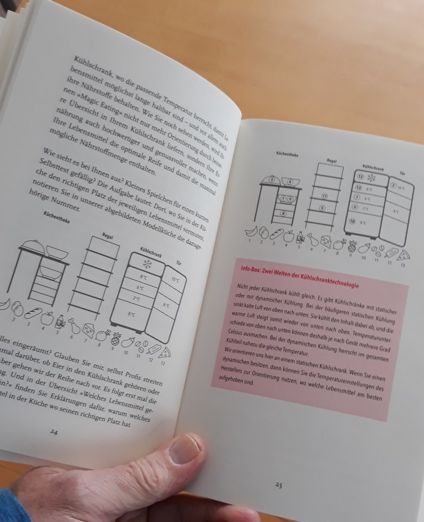 Worum geht es: Der Ernährungswissenschaftler Dr. Malte Rubach zeigt, wie Ordnung im Kühlschrank zu einem gesunden und nachhaltigen Essverhalten führen kann. Mit dem „Magic-Eating“-Konzept wird in diesem Gesundheits-Ratgeber jeder Bereich des Kühlschranks und der Speisekammer genau unter die Lupe genommen. In sechs Schritten geht der Ernährungswissenschaftler darauf ein, wo genau und wie Nahrungsmittel aufbewahrt werden sollen, sodass ihre Nährstoffe bestmöglich erhalten bleiben und optimal zur Gesundheit beitragen. Jedes Lebensmittel kommt auf den Prüfstand und an den richtigen Platz und wird im Zusammenhang einer gesunden und nachhaltigen Ernährung erläutert. Wissenschaftliche Grundlage ist die Planeten-Ernährung, die Mensch und Erde gesund hält und dazu führt, dass weniger Lebensmittel verschwendet werden.