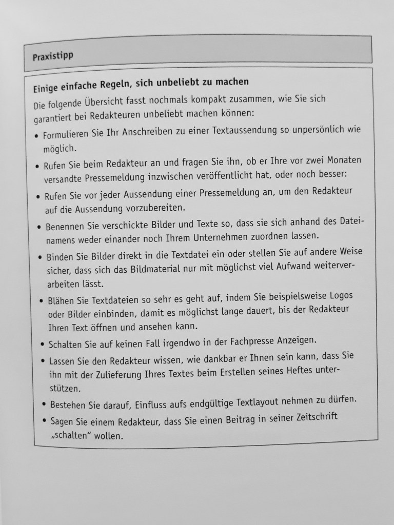 Für dieses hochbrisante Thema gibt es das Buch „Wirkungsvolle Produkt-PR“: Einblicke in die Welt der Fachpresse. Treffender könnte man das Thema Pressearbeit nicht auf den Punkt bringen! Gezeigt wird wie Fachredaktionen und -redakteure arbeiten, wie sie denken, wie Sie ticken und wie man die Hürde Redakteur nimmt. Fachverlage sollten, in der Ausbildung von Redakteuren und Marketing-Fachleuten, dieses Fachbuch mit einbeziehen. Unbedingt lesenswert.