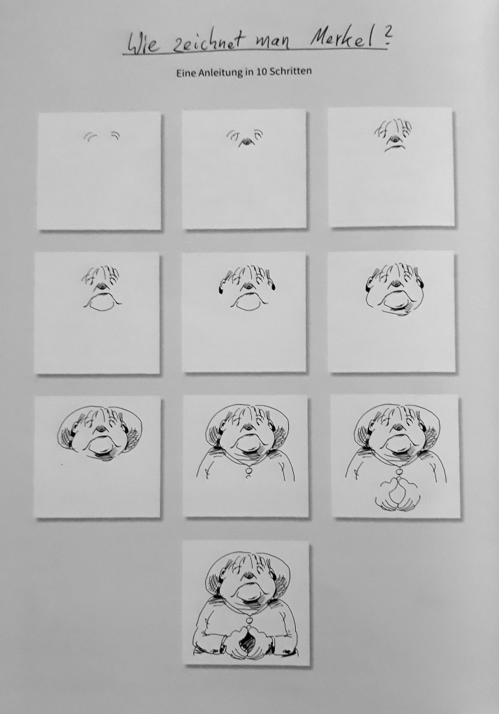 Für jeden, der Frau Merkel auch selber einmal zeichnen möchte, Klaus Stuttmann macht es möglich. Er beschreibt in seinem Buch, wie man die Kanzlerin innerhalb von zehn Schritten zeichnen kann – für jeden die eigene, selbst gezeichnete, Kanzlerin. Das finde ich super, wie auch das komplette Buch – meiner Meinung nach besser als jede geschriebene Biografie.