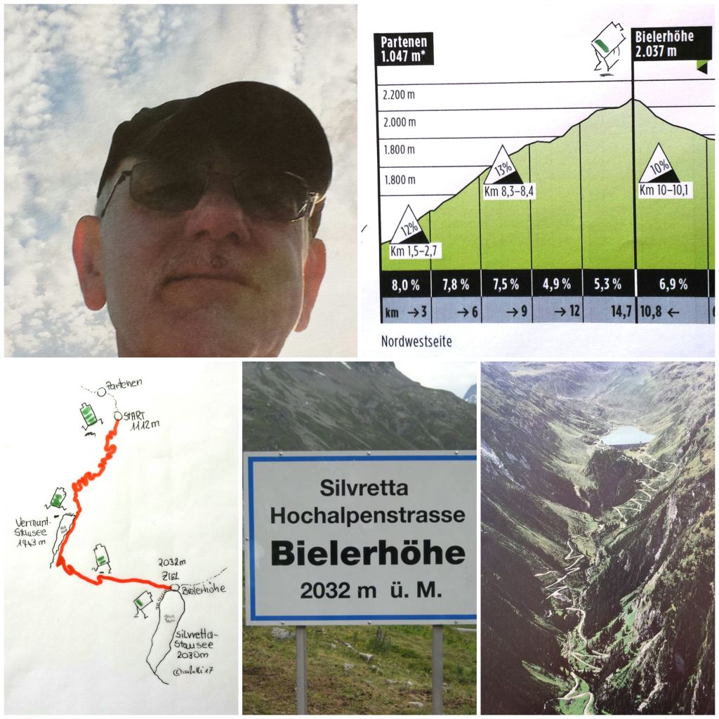 Höhe: Start: Seehöhe Mautstelle Partenen 1.051 m, Ziel die Passhöhe Bielerhöhe 2.032 m bergauf: Steigung 10 % bis max. 13 % in den Kehren ca. 5 %