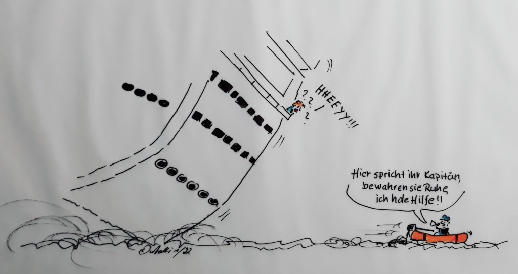 Vor 30 Jahren (10. Januar 1992) gingen, im Nordpazifischen Ozean, ca. 29.000 Badewannentierchen (von der Quietscheente bis zum Frosch) im Meer verloren und lieferten der Wissenschaft einen unverhofften Datenschatz über die Meeresströmungen. (Alle Zeichnungen cartulli 01.2022 – CCC Cuxhaven-Cartoon-Center)Vor zehn Jahren kollidierte die „Costa Concordia“ mit einem Felsen. Diese Kreuzfahrt-Katastrophe kostete 32 Menschen das Leben – wahrscheinlich auch durch die Feigheit des Kapitäns, der das Schiff – sozusagen – als erster verließ.Dauerthema Corona, Impfen – Omikron und Deutschland treffen hart aufeinander.Es ist sehr ERNST, man kann sich keinen Fehler erlauben.