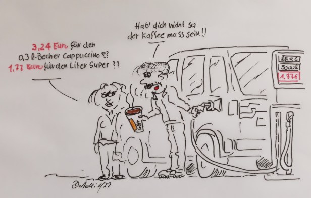cartulli’s Cartoon: Die Kaffee- und Spritpreise steigen. Ein Liter Super kostet zeitweise schon um die 2 Euro. Volltanken und einen großen Kaffee macht da schon ein großes Loch in die Haushaltskasse. Hinweis: Wie dieser Cartoon entstand kostete der Liter Super noch (!!) 1,77 Euro.