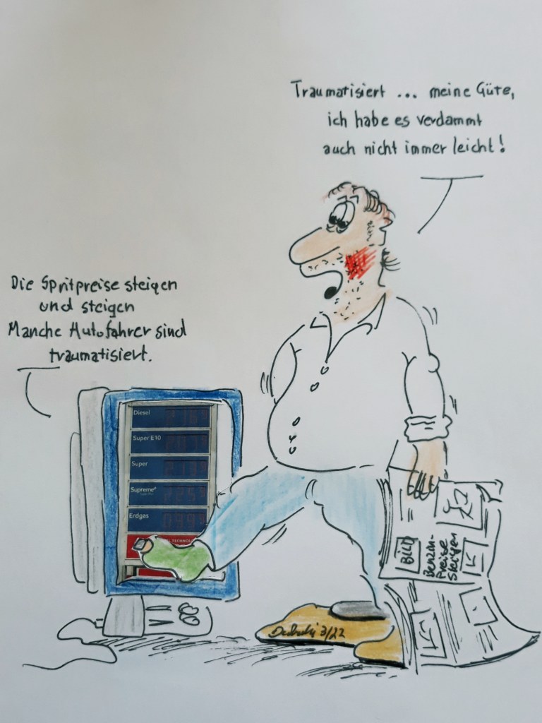 Im Augenblick ein Trend ohne Ende!! Die Spritpreise steigen ins Unendliche, sie liegen im Augenblick bei 2,22 Euro pro Liter Super. Manche Autofahrer sind traumatisiert. Und wieder einmal teilt uns Hans-Günther Sauer, in seiner unnachamlichen Art, seine Meinung dazu mit.Energiekrise in Deutschland: Strom, Gas und Benzin bald nur noch für Reiche bezahlbar. Selbsthilfe ist angebracht – Homeoffice neu definiert.Die Infektionszahlen sind hoch. Trotzdem haben sich Bund und Länder darauf verständigt, die weitreichenden Corona-Maßnahmen in kontrollierten Schritten zurückzufahren. Ich bin dagegen! Schrankenlose Freiheit gibt es nicht – Wer liberal denkt, weiß das ganz genau. Was nun? Maske drauf oder Maske runter? Ich plädiere für Maske drauf! Sicher ist sicher! Lieber die Maske drauf als ans Beatmungsgerät. (Alle Zeichnungen: cartulli – CCC Cuxhaven-Cartoon-Center)