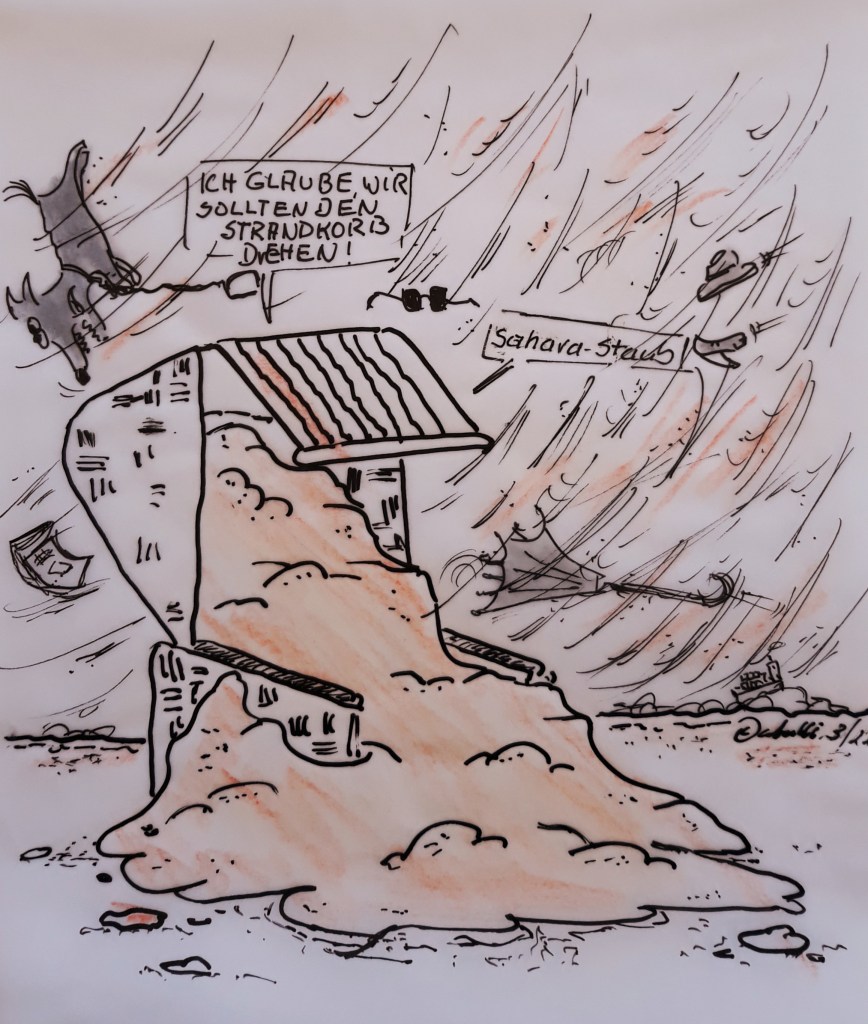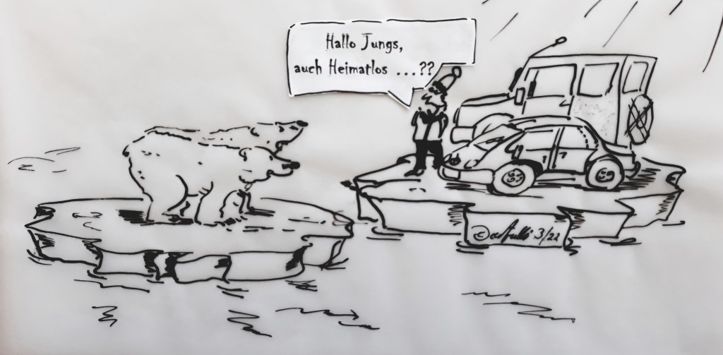 Die Corona-Zahlen sind so hoch wie nie: Niedersachsen setzt Lockerungen zähneknirschend um. Und wieder einmal teilt uns Hans-Günther Sauer, in seiner unnachamlichen Art, seine Meinung mit. Impfskeptiker Sauer glaubt, dass dies die Folgen seiner Corona-Impfung sind.Sahara-Staub in Europa: Das Wetterphänomen sorgte für spektakuläre Lichtstimmungen am Himmel und entsteht, wenn Staub und Sand bei Stürmen in Nordafrika aufgewirbelt und zu uns verfrachtet werden. Für Autofahrer gilt: höchste Vorsicht! Alle auf der Straße parkenden Autos sind mit einer dicken Staubschicht überzogen. Wenn diese falsch entfernt wird, droht Kratzergefahr für Lack und Scheiben. Man stelle sich das mal vor: 277 Riesen-Eiswürfel mit einer Kantenlänge von einem Kilometer – so viel Eis verliert das Grönland-Eisschild jedes Jahr. 277 Gigatonnen! (Alle Zeichnungen: cartulli 3/2022 – CCC Cuxhaven-Cartoon-Center)