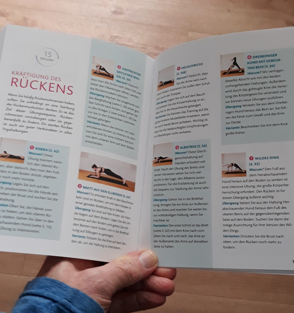 Wenn man Yoga allein zu Hause starten will, bietet „So geht Yoga richtig“ willkommene Hilfe. Die Autorin Tiphaine Cailly zeigt die wichtigsten Übungen in vielen Step-by-Step-Fotos und erklärt mit Dos and Don’ts, welche Fehler zu vermeiden sind. Und das macht das Buch, bzw. die Autorin, wirklich gut. Ab Seite 109 gibt es außerdem Tipps für die Yoga-Sessions, mit verschiedene Übungen zu unterschiedlichen Problemen – Super.
