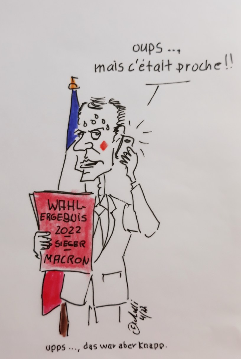 Entspannung in der internationalen Containerschifffahrt ist vorerst nicht in Sicht. Im Gegenteil: Derzeit warten mehr als 600 Schiffe vor den großen Häfen der Welt und sorgen damit für extreme Lieferverzögerungen. Stau auch vor Bremerhaven: Zu Dutzenden liegen die Schiffe auf der Nordsee vor Bremerhaven und warten auf die Einfahrt in einen der deutschen Seehäfen, um dort ihre Ladung umzuschlagen. Ein Video zeigt jetzt den Stauverursacher: hier ein Bild von Ihm!Emmanuel Macron hat bei der Präsidentschaftswahl in Frankreich knapp, aber mit den meisten Stimmen erhalten. Politiker in Europa reagierten auf das Wahlergebnis erleichtert und überbrachten ihre Glückwünsche.Sinkende Preise sind nicht in Sicht. Die Inflationsrate in Deutschland ist im April auf hohem Niveau weiter gestiegen. Vor diesem Hintergrund, hier die allerletzten natürlichen Lebensmittel, mit Preisgarantie (noch). (Alle Bilder cartulli 4/2022 . CCC Cuxhaven-Cartoon-Center)