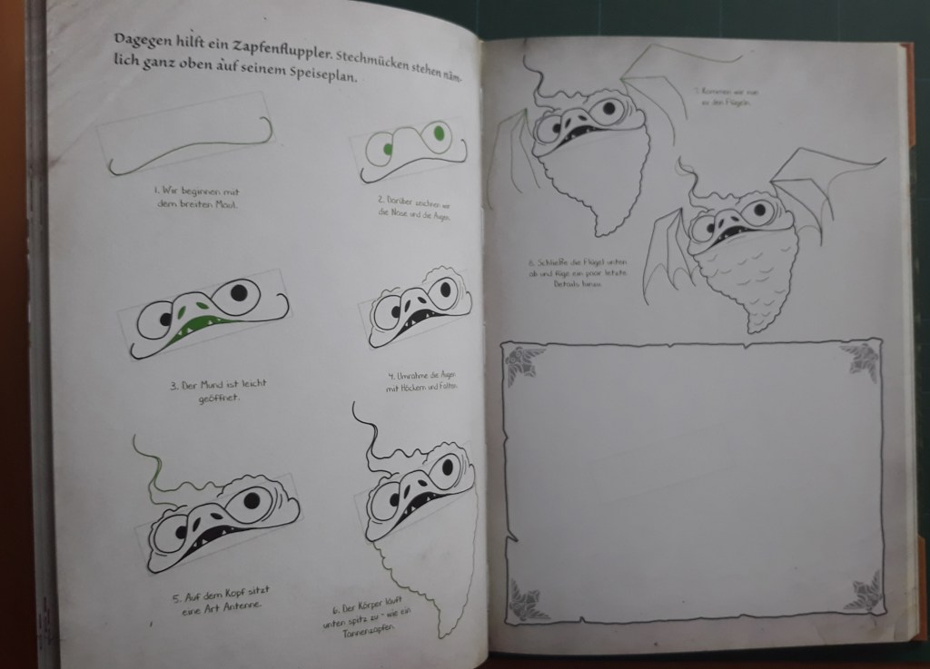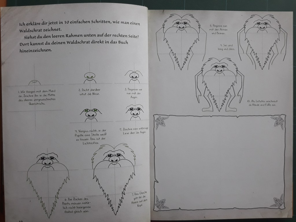 Achtung, und ganz wichtig: Das Buch setzt keine Zeichenkünste voraus. Der Grund, die Bilder sind so gestaltet, dass man Schritt für Schritt zum dargestellten Ergebnis kommt, dafür ist für jeden etwas dabei. Es gibt viele verschiedene Wesen – Monster, Elfen, Zyklope, Gnome, Zentauren, Drachen und viele andere Kreaturen. Die Motivauswahl ist einfach großartig, Fabelwesen eines cooler als das andere. Ein bunter und gelungener Mix.