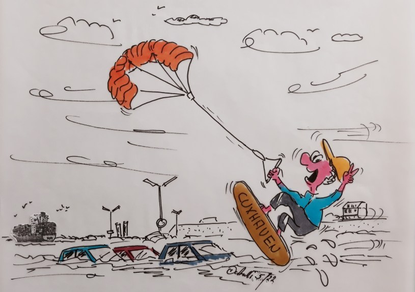 Es weht richtig viel Wind 35-40 km/h, und es ist Hochwaser … usw. viele bleiben jetzt zu Hause. Nicht die Kiter an der Nordsee-Küste. Die Antwort auf schlechtes Wetter ist einfach: Und überhaupt: schlechtes Wetter? Dat gifft an der Nordsee nicht! Also, bei dieser Natur-Situation, sind die „Hochwasser/Sturm-Kiter“ an der Kugelbake anzutreffen.