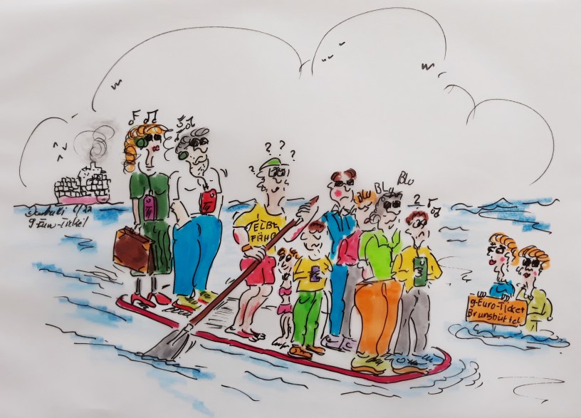 cartulli’s Cartoon: Das 9-Euro-Ticket im Einsatz beim Elbefähre-Ersatzverkehr (Die Elbefähre wurde ja leider eingestellt) Cuxhaven-Brunsbüttel-Cuxhaven. (Zeichnung: cartulli 6/2022 – CCC Cuxhavener-Cartoon-Center – Die Storyfactory)