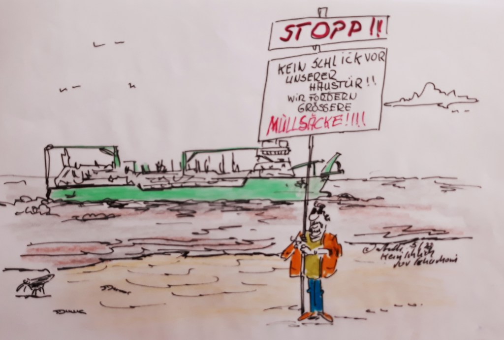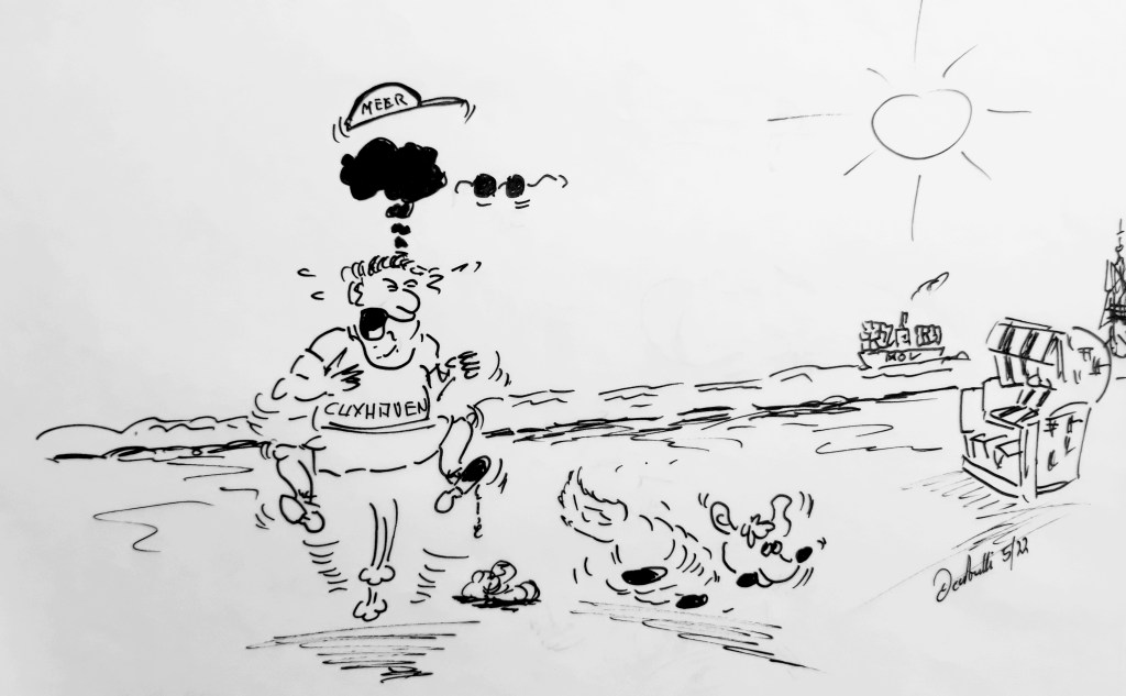 Ich kann sagen – da ich jeden Tag dort meine Laufrunde mache – mal ist es sauber und mal laufen die Mülleimer über. Also regelmäßig reinigen sieht anders aus.… und dann wäre da noch das leidige Problem mit dem Schlick aus Hamburg, vor Cuxhaven’s Haustür. (Zeichnugrn: cartulli 5/22 – CCC Cuxhavener-Cartoon-Center – Die Storyfactory)