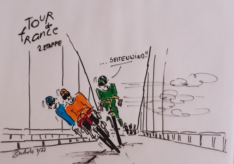 cartulli’s Tour de France-Cartoon: Die Tour de France 2022 läuft. In den kommenden drei Wochen der Tour, gibt es hier „cartulli’s Tour de France-Cartoon“. Schaut regelmäßig rein und lasst euch überraschen. Heute, die 2. Etappe, mit der Überquerung der 18 Kilometer langen Storebaelt (Großer Belt)-Brücke – mit Seitenwind.