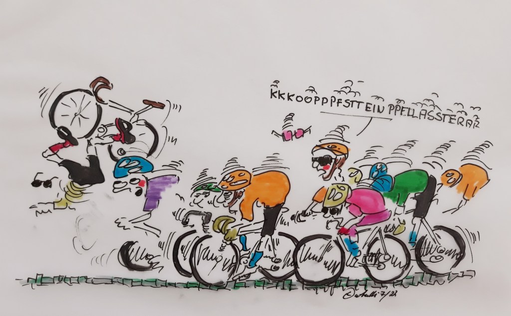 cartulli’s Tour de France-Cartoon: Die Tour de France 2022 läuft. In den kommenden drei Wochen der Tour, gibt es hier „cartulli’s Tour de France-Cartoon“. Schaut regelmäßig rein und lasst euch überraschen. Heute, die 5. Etappe. Auf Kopfsteinpflaster ist es mit der Ruhe vorbei. Die 5. Etappe führt über das gefürchtete Pavé in Frankreichs Norden.