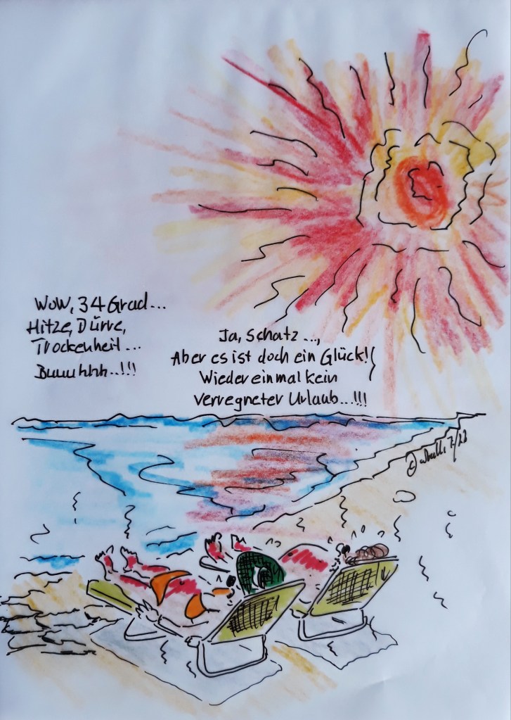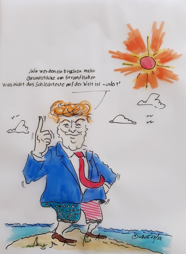 Weiter hohe Temperaturen in Südeuropa: Hitze, Dürre – und Waldbrände. Eine Hitzewelle hat den Süden Europas im Griff. Die Thermometer zeigen Spitzenwerte. Und die anhaltende Dürre führt weiterhin zu Waldbränden.Die Stones spielten vor 60 Jahren ihr erstes Konzert. Wer am Schlagzeug saß und unter welchem Namen genau die Band auftrat, ist nicht ganz klar – fest steht aber: Am 12. Juli 1962 spielten die Rolling Stones in London ihr erstes Konzert. Weder das Publikum im Marquee Club noch die Musiker selbst ahnten damals, dass die Stones wenig später Superstars werden. 60 Jahre ist der historische Auftritt im Marquee Club nun her, bei dem die Band erstmals als „The Rollin‘ Stones“ auftrat, angeblich sogar als „Mick Jagger and The Rollin‘ Stones“.„Wir werden ein bisschen mehr Grundstücke am Strand haben, was nicht das Schlechteste auf der Welt ist“, sagte Trump bei einem Wahlkampfauftritt in Anchorage im US-Bundesstaat Alaska – Wo holt der bloß immer wieder diese Weisheiten her. Velleicht nach dem Motto: Ich mache mir die Welt, so wie sie mir gefällt? (Alle Zeichnungen: cartulli 07/2022 CCC Cuxhaven-Cartoon-Center – Die Storyfactory)