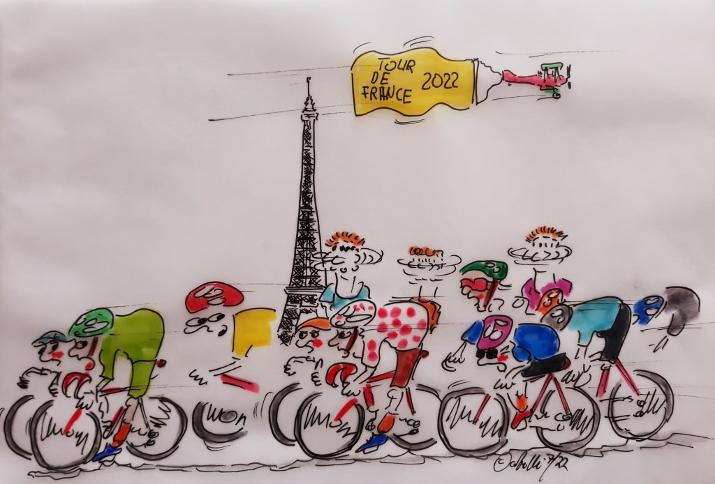cartulli’s Tour de France-Cartoon: Die Tour de France 2022 läuft. Dazu gibt es hier „cartulli’s Tour de France-Cartoon“. Schaut regelmäßig rein und lasst euch überraschen. Heute, die 21. Etappe, die Schlußetappe über 115,6 km, von Paris La Defense Arena bis Paris Champs-Élysées. Die gut 115 Schlusskilometer der Tour 2022 starten also unter Dach, anschließend klettern die Fahrer auf den Mont Valérien mit der Cote du Pavé des Gardes, bevor sie nach Versailles zurückkehren und die bekannte Route auf die Champs-Élysées nehmen.