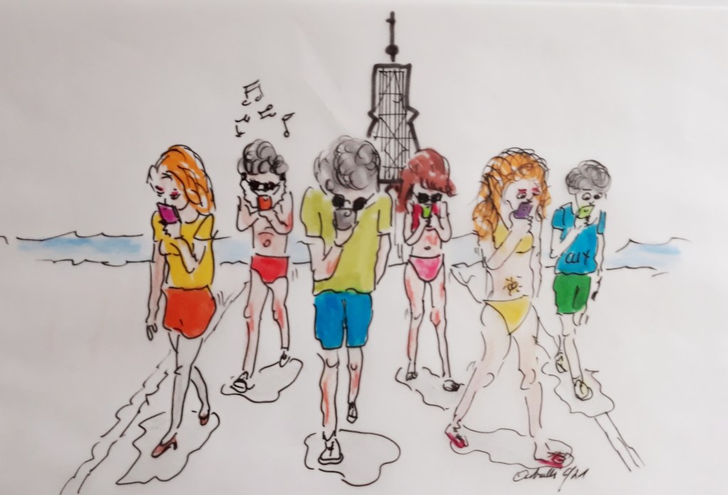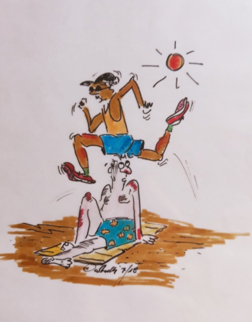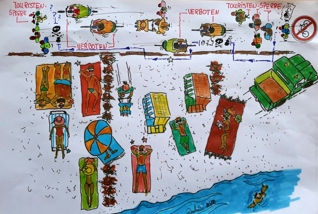 Ich schreibe und zeichne jetzt schon seit Jahren über dieses Thema, aber Besserung ist nicht in Sicht. Was ich meine ist dies: Früh am Morgen, Mittags oder am Abend, die Promenade in Duhnen, Döse und an der Grimmershörner Bucht zählen zu den beliebtesten Strecken für alles was Beine und Räder hat. Aber wie heißt es in dem Spruch: „Es kann der Mensch nicht im Frieden leben, wenn es dem Kurtaxe zahlenden Touristen (bösen Nachbarn) nicht gefällt“.
