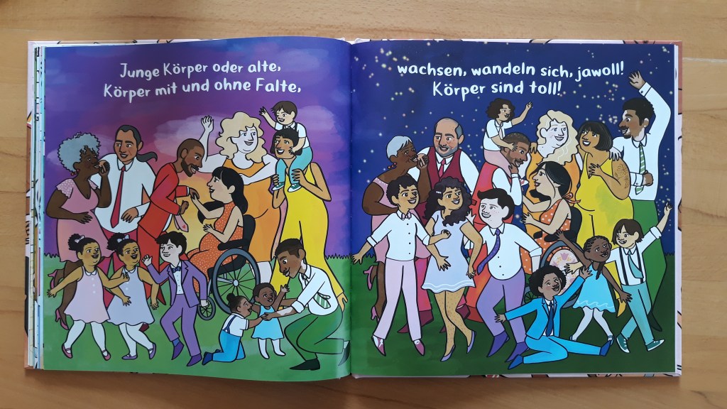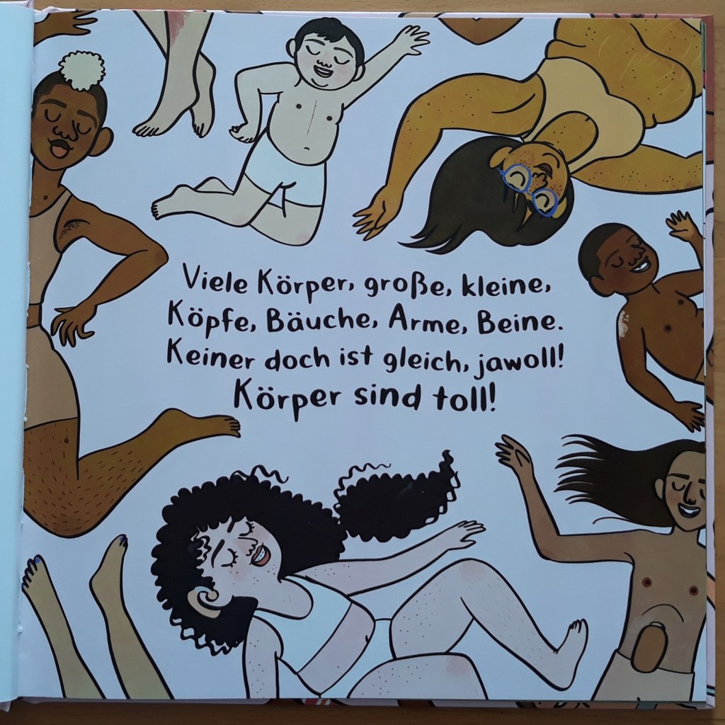 Warum ich das Buch empfehle: WOW …das ist mal ein Kinderbuch!“!! Interessant, das Buch lebt allein von seinen Bildern – von den vielen Körpern die überall zu sehen sind – egal ob behaart, Sommersprossen, Rollstuhl, Prothesen, dick, dünn, tätowiert…. man kann gar nicht alle aufzählen. Wichtig, endlich einmal ein Kinderbauch, das auf den, viel zu oft in solchen Büchern gezeigten, Perfektionismus verzichten kann.