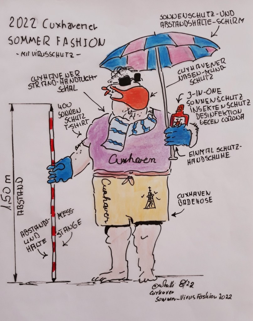 In dieser – immer noch präsenten – Corona-Pandemie, ändert sich auch die Mode für den Strand! Hier die 2022er Cuxhavener Sommer-Fashion (mit Virenschutz).