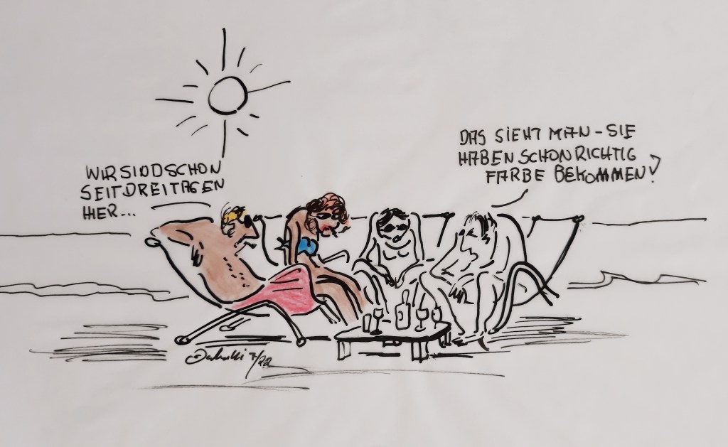 Sommer, Sonne, Sonnenschein – Cuxhaven ist IN. Also ab in den Liegestuhl, in den Strandkorb, auf das Badetuch. Die Straßen sind voll in Cuxhaven. Klares Zeichen: Der Tourismus in Cuxhaven boomt. (Zeichnung: cartulli – CCC Cuxhaven-Cartoon-Center – Die Storyfactory)