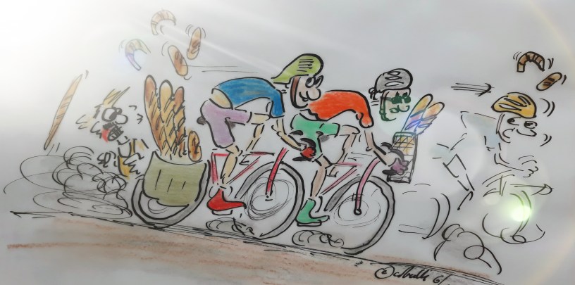 Es ist Sonntagmorgen 7:30 Brötchen-Einkaufzeit der Touristen – und das muss schnell gehen, denn die Familie wartet schon am Frühstückstisch auf den Papa. So, erst vorgestern, selbst erlebt! (Zeichnung: cartulli 2022 – CCC Cuxhaven-Cartoon-Center – Die Storyfactory)