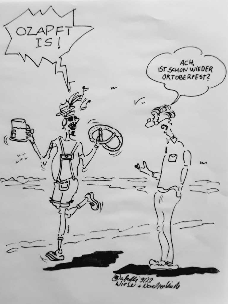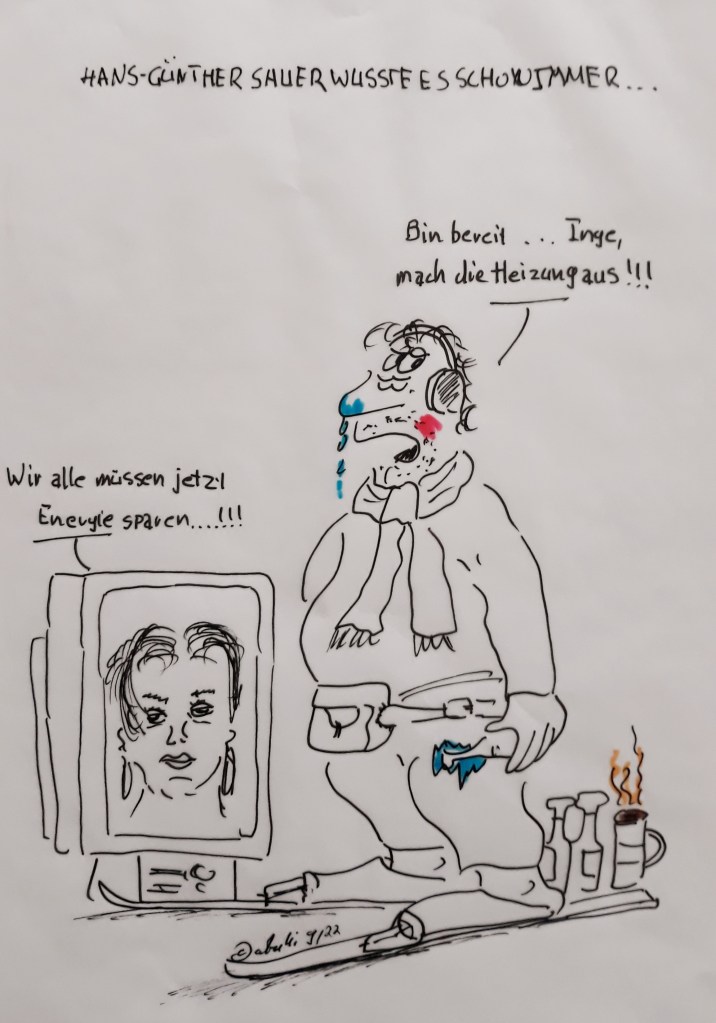 Hans-Günther Sauer wusste es schon immer … Energie sparen – so geht’s: Als Folgen der Corona-Pandemie und des Kriegs gegen die Ukraine sind die Energiepreise auf Rekord-Niveau geklettert. Wer den Geldbeutel schonen möchte, kann Gas, Strom und Sprit sparen. Die wichtigsten Tipps: Beim Wasserkocher auf die Füllmenge achten; Ohne Vorheizen backen – mit Restwärme kochen; Kochen mit Deckel; Energiesparenden Kühlschrank wählen; Kühlschrank und Gefriertruhe abtauen lassen; Kühlschranktür schnell schließen; Extra-Kühlgeräte stilllegen, Waschmaschine mit Warmwasseranschluss nutzen; Waschen ohne Vorwäsche; Wäsche mit 30 °C waschen.Mit dem Tod seiner Mutter Elisabeth II. am 8. September 2022 wurde Charlesunmittelbar Königdes Vereinigten Königreiches. Charles Philip Arthur George ist jetzt König des Vereinigten Königreichs Großbritannien und Nordirland sowie von 14 weiteren, als Commonwealth Realms bezeichneten souveräne Staaten einschließlich ihrer Territorien und abhängigen Gebiete. Darüber hinaus ist er Oberhaupt des 56 Staaten umfassenden Commonwealth of Nations, Lehnsherr der britischen Kronbesitzungen sowie weltliches Oberhaupt der anglikanischen Staatskirche und Oberbefehlshaber der britischen Streitkräfte. O’zapft is – Die Wiesn 2022 beginnt. Zweimal wurde das Münchner Oktoberfest pandemiebedingt abgesagt, heuer findet es wieder statt. Punkt zwölf Uhr mittags hieß es am Samstag ganz traditionell: „O’zapft is!“ Gefeiert wird bis zum 3. Oktober – unter besonderen Bedingungen. An die 40 Zelte mit insgesamt 120.000 Sitzplätzen sind aufgebaut, dazu 180 Fahrgeschäfte und „Belustigungsbetriebe“. Spezielle Corona-Regeln gelten nicht beim Oktoberfest. Folglich gibt es auch keine Maskenpflich. Allerdings wird zum freiwilligen Test vor dem Besuch geraten. Viele Infektiologen rechnen aber mit einem Anstieg der Corona-Zahlen. Auch an der Nordsee schlägt sich die Wiesn nieder. (Zeichnungen: cartulli 9/2022 – CCC Cuxhaven-Cartoon-Center – Die Storyfactory)