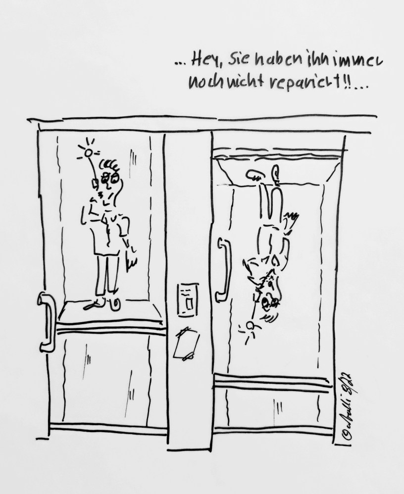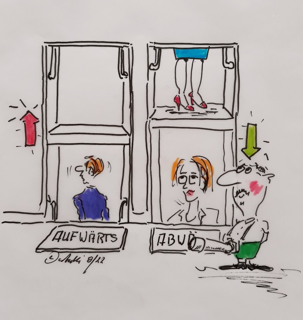 Im Sommer, waren die Fahrten mit dem Paternoster dann immer etwas Besonderes. Zu Beginn meiner Arbeit dort, hatten mich die Männer-Ansammlungen vor dem Paternoster – gerade in der Mittagpause – erstaunt. Hier der Grund: Eine Fahrt im Paternoster gewährt manchmal interessante Einblicke. Frauen in Röcken sollten sich demnach nicht zu nahe an den Ein- oder Ausstieg wagen. Das wurde damals von der männlichen Belegschaft sehr ausgenutzt. Bis die Firmenleitung ein Schild anbrachte, das Frauen mit zu kurzen Röcken (??) den Paternoster doch lieber meiden sollten – naja, mache Mitarbeiterinnen haben sich daraus aber auch einen Spaß gemacht. Und ja, in den vierten Stock, mehrmals während der Arbeitszeit, rauf und runter laufen, ist halt auch nicht jedermanns Sache.