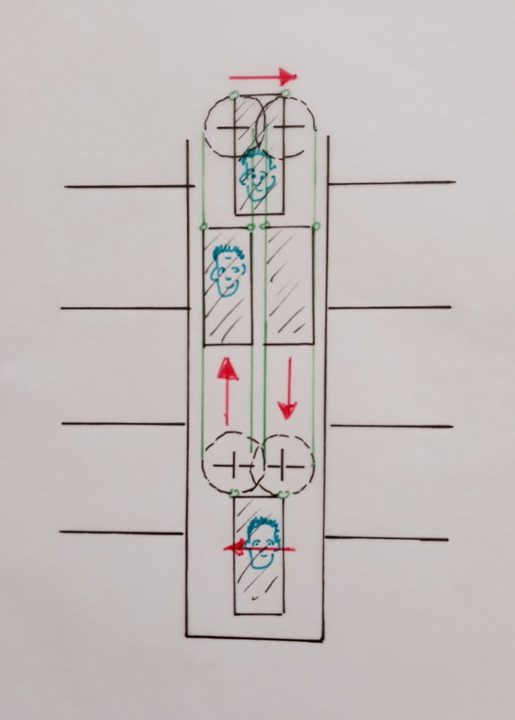 Man steht davor und …. …….. die Sorge, dass, wenn man nicht rechtzeitig aussteigt, oder auch gar nicht erst rein kommt, hält sich auch heute noch. Dieses leise Rumpeln der Kette ist deutlich wahrzunehmen. Auf jeder vorbeiziehenden Etage ist etwas Anderes zu sehen. Doch was passiert eigentlich, wenn der Ausstieg im obersten Stockwerk nicht gelingt? Geht die Fahrt dann kopfüber weiter?