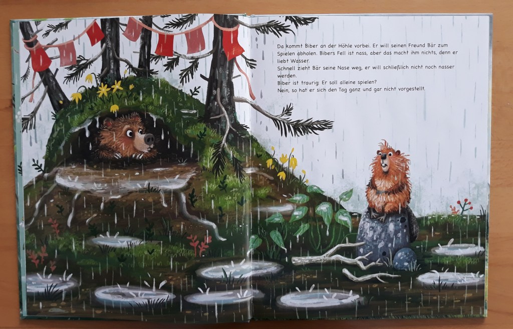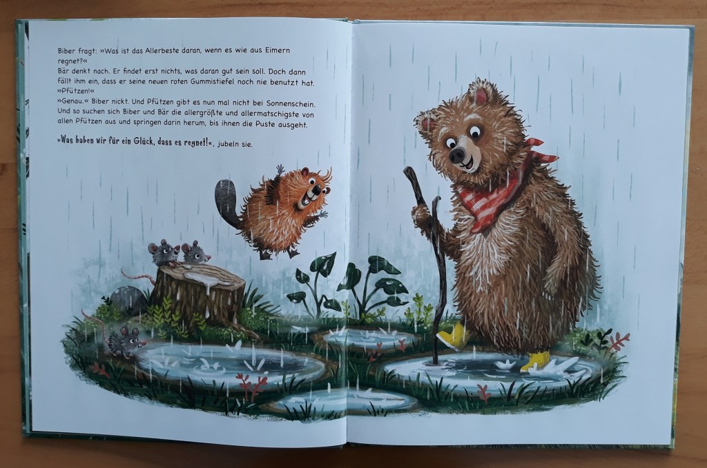 „Heute ist der schönste Tag!“ sagt der Bär, und der Biber nickt „Weil wir ihn dazu gemacht haben!“ An dieser Einstellung könnten sich auch viele Erwachsene ein Beispiel nehmen.