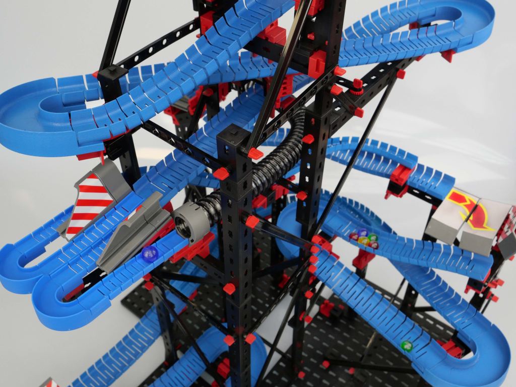Der Kugelparcours des neuen fischertechnik Baukastens Marble Competition ermöglicht waghalsige Rennen mit überraschenden Verläufen.