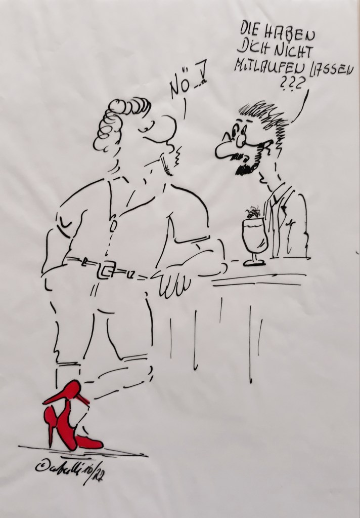 Mindestens 15 Zentimeter Absatz: Dutzende sprinten in High-Heels durch Madrid. Es ist eine skurrile und für die Teilnehmer oft schmerzhafte Tradition während der Pride Week in Madrid: Dutzende Sprinter ziehen sich hohe Absatzschuhe an und rennen um die Wette durch die Innenstadt. Der Sieger bekommt Schmerzensgeld, die Verlierer ihren Spaß, die Zuschauer einen kuriosen Anblick. (Alle Zeichnungen: cartulli 11/2022 – CCC Cuxhaven-Cartoon-Center – Die Storyfactory)