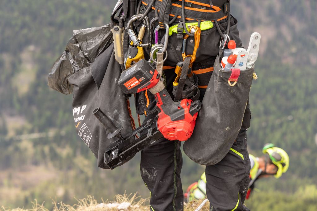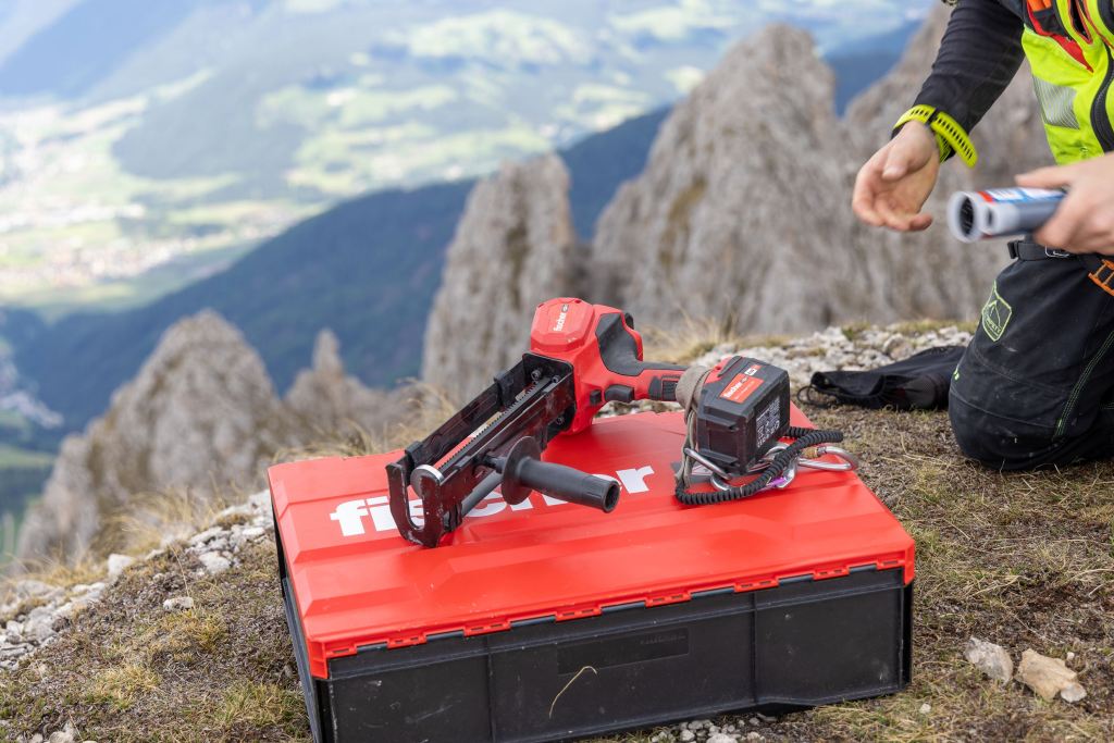 Die speziellen Verankerungspunkte auf dem Klettersteig mussten bis in eine beträchtliche Tiefe reichen. Um den Mörtel in die tiefen Löcher zu injizieren, verwendeten die Bauausführenden von KronSafety das neue fischer Akku-Auspressgerät FIS DB S Pro, den in Italien verfügbaren Verlängerungsschlauch FIS EXT für den Statikmischer und konische Adapter für Löcher von 20 mm bis 40 mm. Bürsten mit Verlängerungen und SDS-Aufnahmen erleichterten und beschleunigten zudem die Bohrlochreinigung.