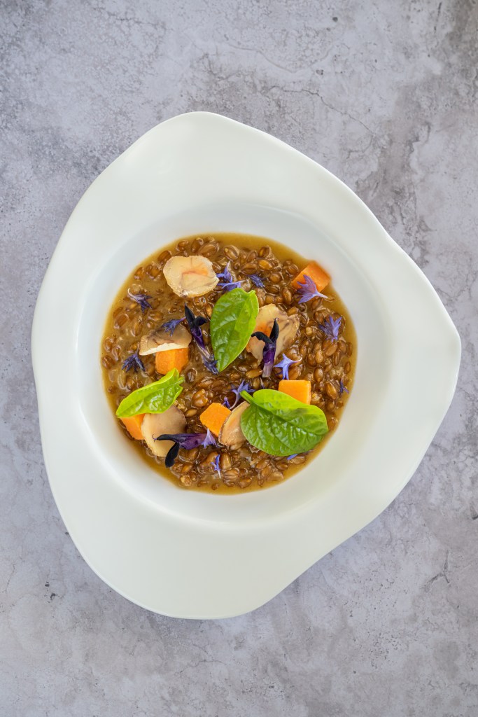 Risotto: Die gehackten Zwiebeln ohne Farbe mit Olivenöl anschwitzen. Einkorn zugeben, mit Weißwein ablöschen und bis zur Hälfte mit Wasser auffüllen. Diesen Vorgang bis zum Ende der Garzeit wiederholen (der Dinkel muss schmelzen, aber das Korn muss ganz bleiben). Bei Raumtemperatur beiseite stellen.