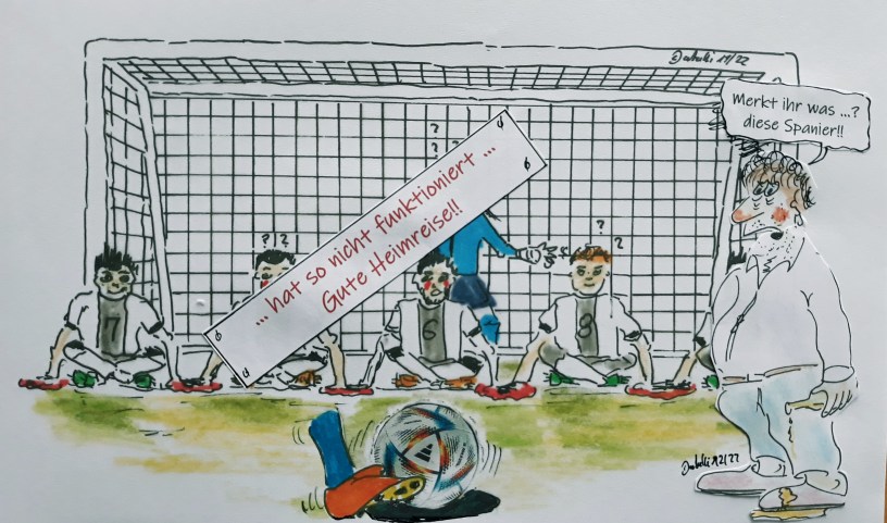 Deutschland ist AUSGESCHIEDEN!! Der Ideen-Klau bei den Klima-Kleber-Aktivisten hat so nicht funktioniert. Hans-Günther Sauer wusste es schon immer: „… es waren die Spanier“. Tschüß Deutschland, wir werden euch nicht vermissen. Aber jetzt können wir wieder, entspannt und in Ruhe, zum Glühwein trinken auf den Weihnachtsmarkt.