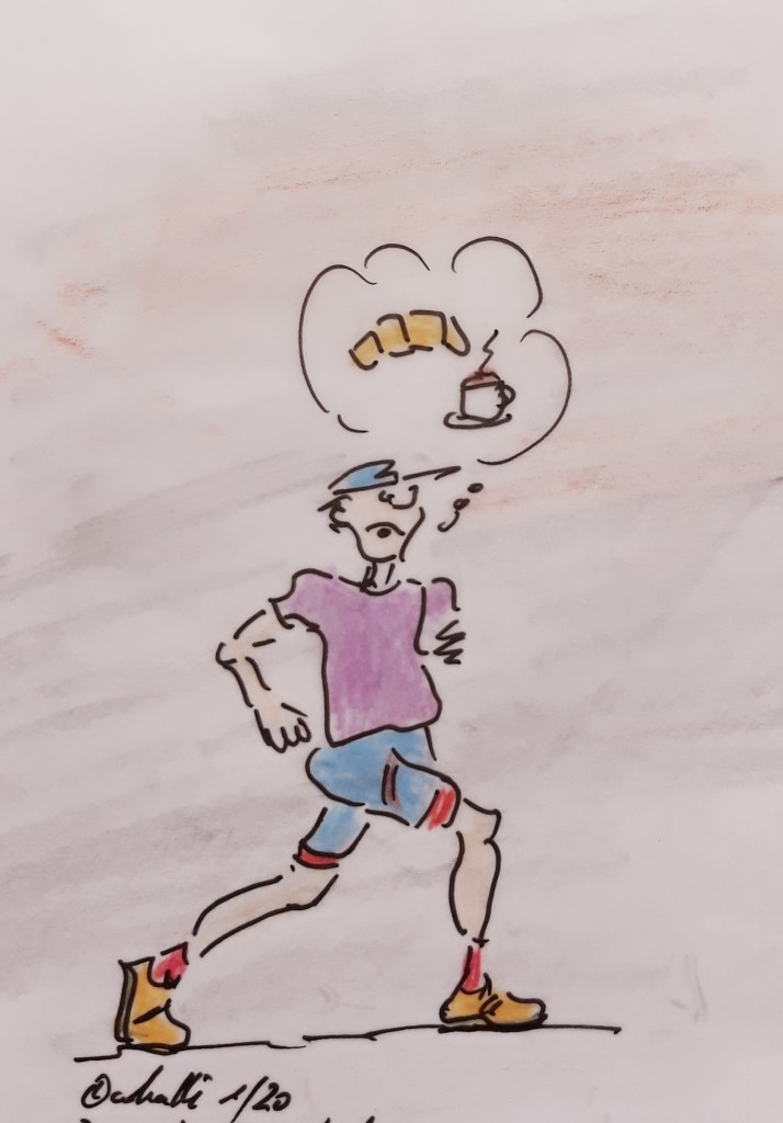 Ihr meint, das ist doch langweilig? Bei Gott NEIN! Zu dieser – Touristen freien Zeit – ist der Strand noch leer und ein sehr guter Ort um den Kopf frei zu Laufen und zu bekommen. Und noch eins, man trifft hin und wieder auf ganz besondere Läufertypen. Heute Morgen war es der, der immer zum Bäcker läuft und mit einem Croissant im Mund zurück kommt.