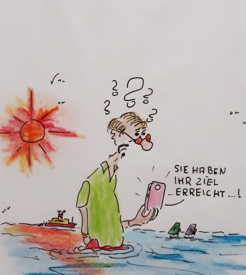 Auch heute aktueller denn je: Nicht immer macht eine Handy-App Sinn! Ulli’s neue Lauf-App nervt gewaltig! (Zeichnung: cartulli 1/2023 – CCC Cuxhaven-Cartoon-Center – Die Storyfactory)