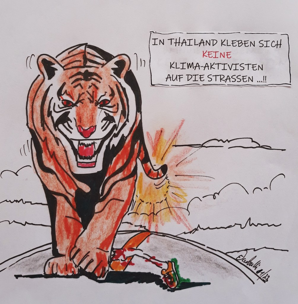 Doppelmoral bei den Klima-Aktivisten: Bei einem Prozess in Deutschland flog auf, dass zwei Klima-Kleber auf Urlaub nach Asien (Thailand) geflogen sind. Vor kurzem blockierten Luisa und ihr Freund Yannick mit anderen Klima-Klebern noch den Berufsverkehr in Stuttgart. Später dann saß das Paar in einem Flieger ins asiatische Urlaubs-Paradies, der rund 140 000 Liter Kerosin verbrauchte. Neues Motto: „Öl verbrennen statt sparen“. Besonders dreist ist die Erklärung, der „Letzten Generation“ zu der Urlaubsaktion: „Sie haben den Flug als Privatleute gebucht, nicht als Klimaschützer. Das muss man auseinanderhalten.“ Was zwar nichts am CO2- Ausstoß ändert, aber zumindest die Doppelmoral mancher Klimaschützer entlarvt. Diese Dreistigkeit macht fassungslos. Außerdem, in Asien würde sich bestimmt keiner auif die Straße kleben! (Alle Zeichnungen: cartulli 02.2023 – CCC Cuxhaven-Cartoon-Center – Die Storyfactory)