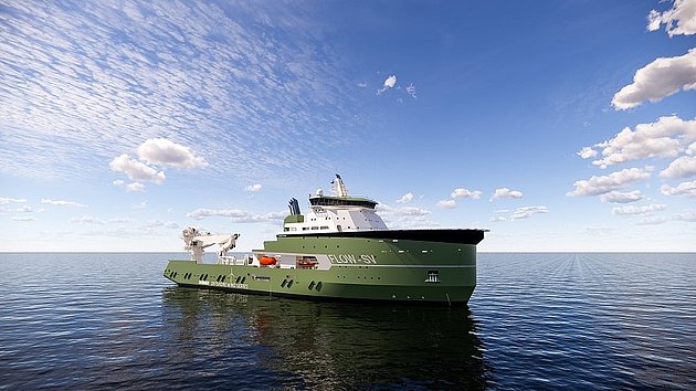 Die niederländische Damen-Gruppe hat ein Konzeptentwurf für ein Multifunktionsschiff vorgestellt, das für den Einsatz in schwimmenden Offshore-Windparks konzipiert ist. Das rund 150 m lange, 32 m breite FLOW-SV-Schiff soll bis zu neun Anker oder Saugpfähle installieren und befestigen können und damit die Positionierung von drei schwimmenden Turbinen in einem einzigen Einsatz ermöglichen, so die Designer.
