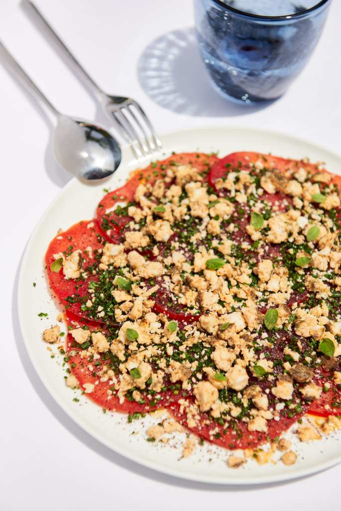 Die Ochsenherztomate in 3 mm dicke Scheiben schneiden und auf einem Teller als Carpaccio anrichten. Mit Fleur de Sel und Pfeffer würzen. Anschließend die Tomaten mit Sumach bestreuen. Den Shanklish-Käse zerbröckeln und auf der Tomate anrichten. Großzügig mit Basilikumöl beträufeln. Zum Schluss mit dem geschnittenen Schnittlauch sowie den Oreganoblättern dekorieren.