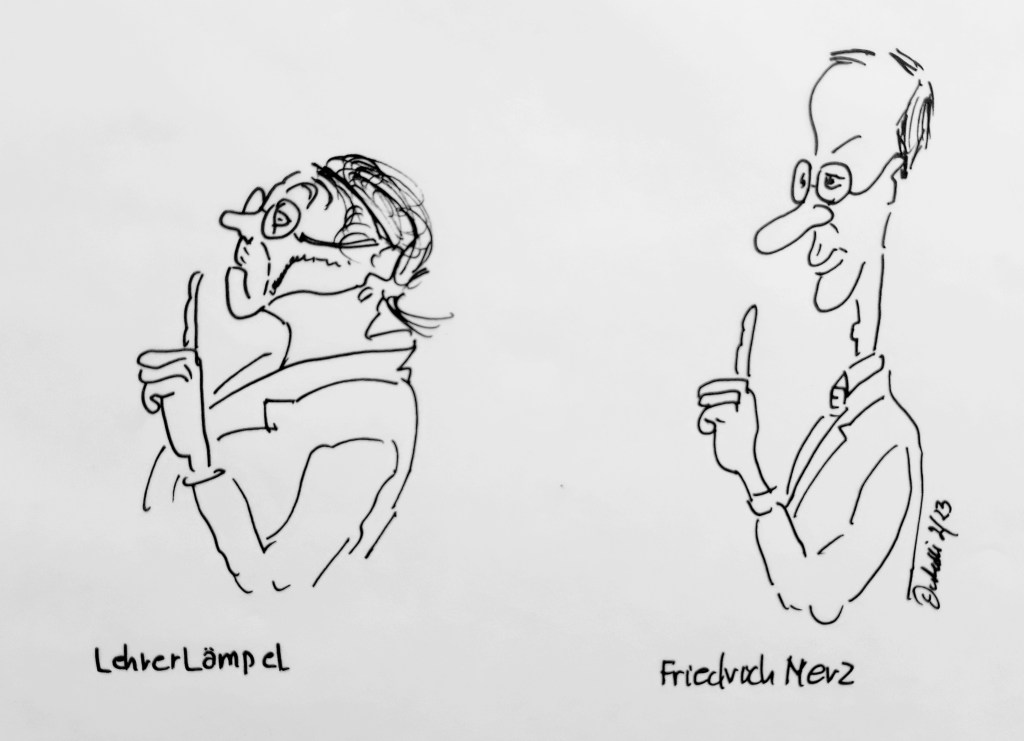 Friedrich Merz, Mitglied des Deutschen Bundestages, und eine Art Lehrer Lämpel (Wilhem Busch – Max und Moritz) der CDU. Eine gewisse Ähnlichkeit ist deutlich erkennbar. (Zeichnung: cartulli 2/23 – CCC Cuxhaven_Cartoon-Center – Die Storyfactory)