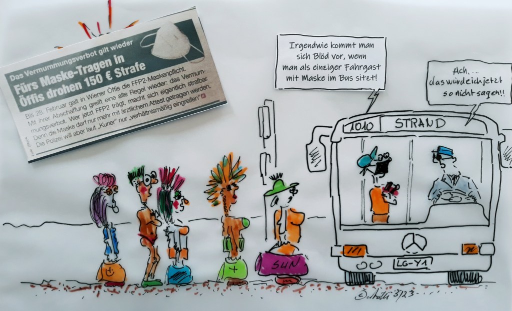 Seit einiger Zeit ist das Tragen von Schutzmasken – auch bei uns in Cuxhaven – keine Pflicht mehr. Hier aber dazu eine Nachricht von unseren Nachbarn aus Wien. Auch dort wurde, in den Wiener Öffis, die Maskenpflicht abgeschafft. Damit aber greift eine alte Regel wieder: das Vermummungsverbot! Wer jetzt Maske trägt, macht sich EIGENTLICH strafbar. Fürs Maske-Tragen in den Öffis drohen dann 150 Euro Strafe – So war es dort, in der Zeitung zu lesen. Die Polizei will sich aber zurückhalten (verhältnismäßig eingreifen), was das auch immer heißen mag. Wie blöd ist das denn?- (Zeichnung: cartulli 2023 – CCC Cuxhaven-Cartoon-Center)