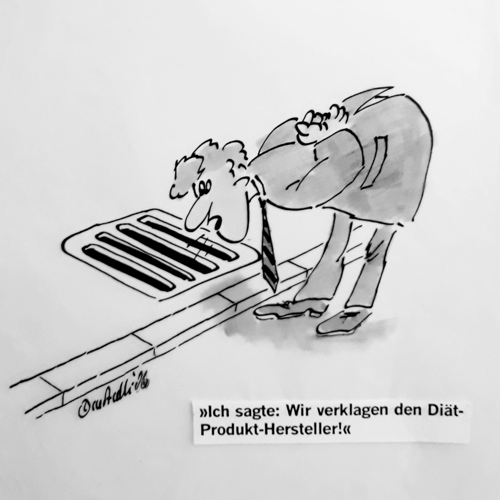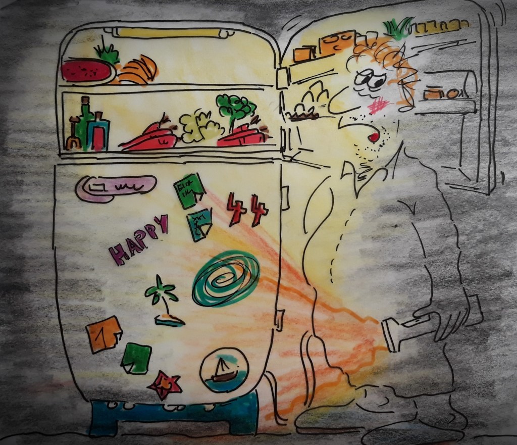 Nacht’s am Kühlschrank …. sollte man vermeiden, auch wenn dafür das Licht eingebaut wurde. (Zeichnungen: cartulli – zur Illustration dieser Buchrezension – CCC Cuxhaven-Cartoon.Center – Die Storyfactory)