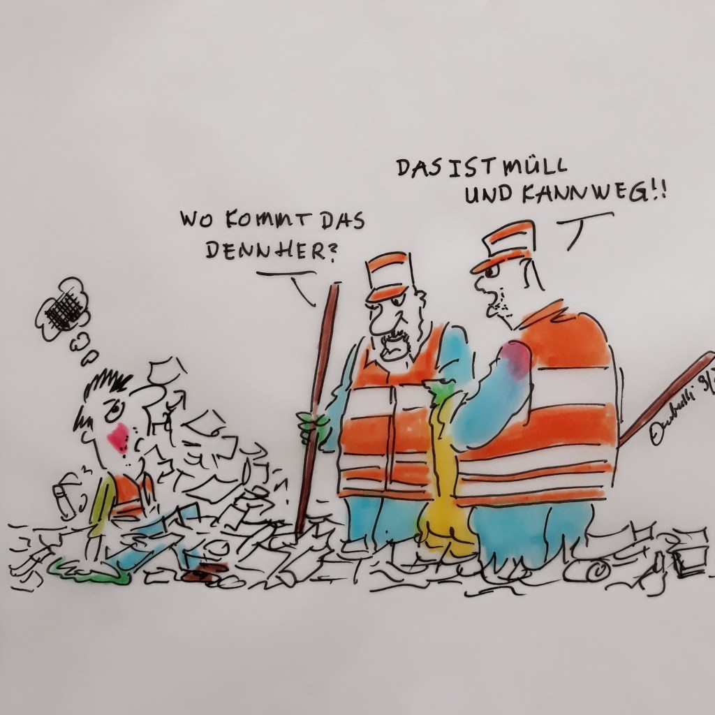 Probleme mit dem Müll, nach einer Klima-Kleber-Aktivisten-Demo – einfach gelöst. (Zeichnung: cartulli 3/23 – CCC Cuxhaven-Cartoon-Center – Die Storyfactory)