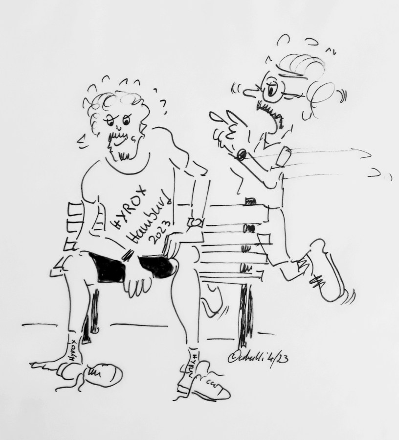 Fertig?? … Nö, noch 3 Runden. (Alle Zeichnungen: cartulli 4/23 – CCC Cuxhaven-Cartoon-Center – Die Storyfactory)