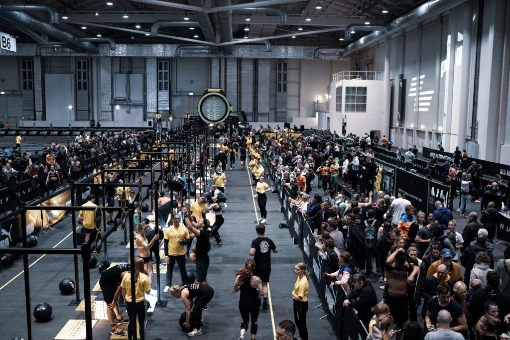 Wie läuft ein HYROX-Event ab? Die Laufstrecke wird drinnen auf einer angelegten Rundbahn zurückgelegt, ab und zu aber auch auf einem Laufband. Im In-Field befinden sich dann die verschiedenen Fitnessstationen, die es nach jedem Laufintervall zu absolvieren gilt. Insgesamt werden 8-mal 1 km Laufintervall und 8 verschiedene Fitnessübungen absolviert. Für das komplette Event braucht man im Schnitt 1,5 bis 2 Stunden, das ist in etwa mit einem Triathlon in der Sprint-Distanz vergleichbar. Damit es auf der Laufrunde oder an den Kraftstationen nicht zu Wartezeiten kommt, werden jeweils 30 bis 40 Teilnehmer in Abständen von 10 Minuten auf die Strecke gelassen. Es zählt nur die Zeit, die man für den Parcours benötigt. Pro Event wird zukünftig mit 1500 bis 2500 Teilnehmern gerechnet.