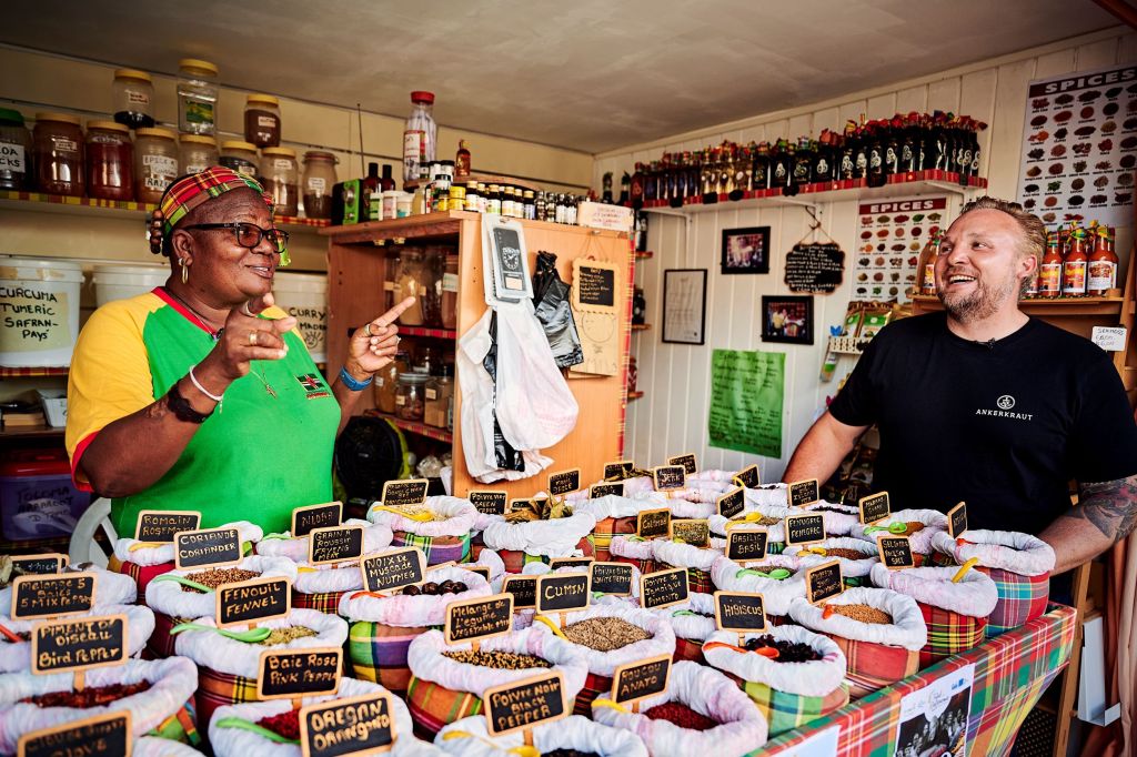 Stefan Lemcke von Ankerkraut durfte bei der Recherchereise die Vielfalt der kreolischen Küche an Milo’s Gewürzstand kennenlernen. © Ankerkraut