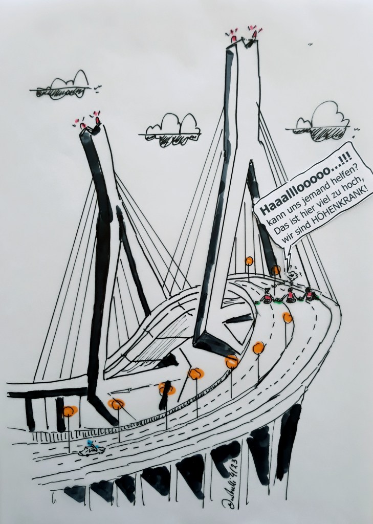 „Klima-Kleber“ blockieren Hamburger Köhlbrandbrücke: Mehrere Klima-Aktivisten und -Aktivistinnen der Gruppe „Letzte Generation“ hatten am Dienstag den Verkehr auf der Hamburger Köhlbrandbrücke blockiert. Die Aktivisten waren mit einem Lkw auf die Brücke gefahren. Dort kippten sie auf der Fahrbahn Kies aus. Auf der Gegenfahrbahn sprangen gleichzeitig mehrere Klima-Kleber aus einem Transporter und klebten sich auf der Straße fest. Einer kettete sich an den Transporter und schmiss den Zündschlüssel von der Brücke. Hallo, ich glaube da gibt es große Probleme bei der Rekrutierung neuer Mitglieder (so scheint unser Karikaturist es wenigsten festgestellt zu haben).